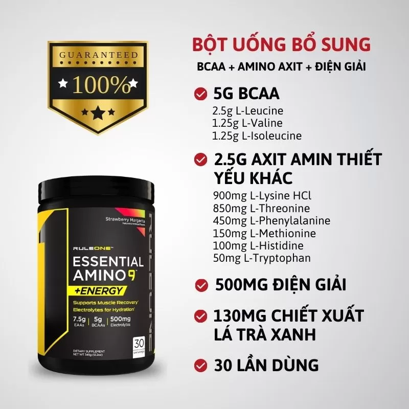 Một serving của Rule1 Essential Amino 9 + Energy chứa tới 7.5g EAA và 5g BCAA. Đây là hàm lượng axit amin được đánh giá là cao hơn hẳn so với các sản phẩm cùng phân khúc. Với 9 loại axit amin này có tác dụng phục hồi cơ bắp, tái tạo mô cơ bắp hiệu quả để xây dựng phát triển cơ bắp tối ưu hơn.